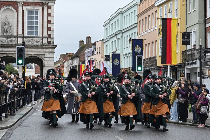 Britische und deutsche Flaggen entlang der Straße, Mitglieder der Pipes No. 12 Company Irish Guards spielen im Rahmen der Wachablösung vor dem Windsor Castle in Windsor am 27. November 2025: Vorarbeiten vor dem Staatsbesuch des deutschen Bundespräsidenten Frank-Walter Steinmeier im Dezember. Foto: Justin Tallis/AFP via Getty Images
