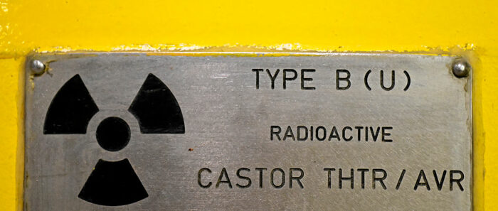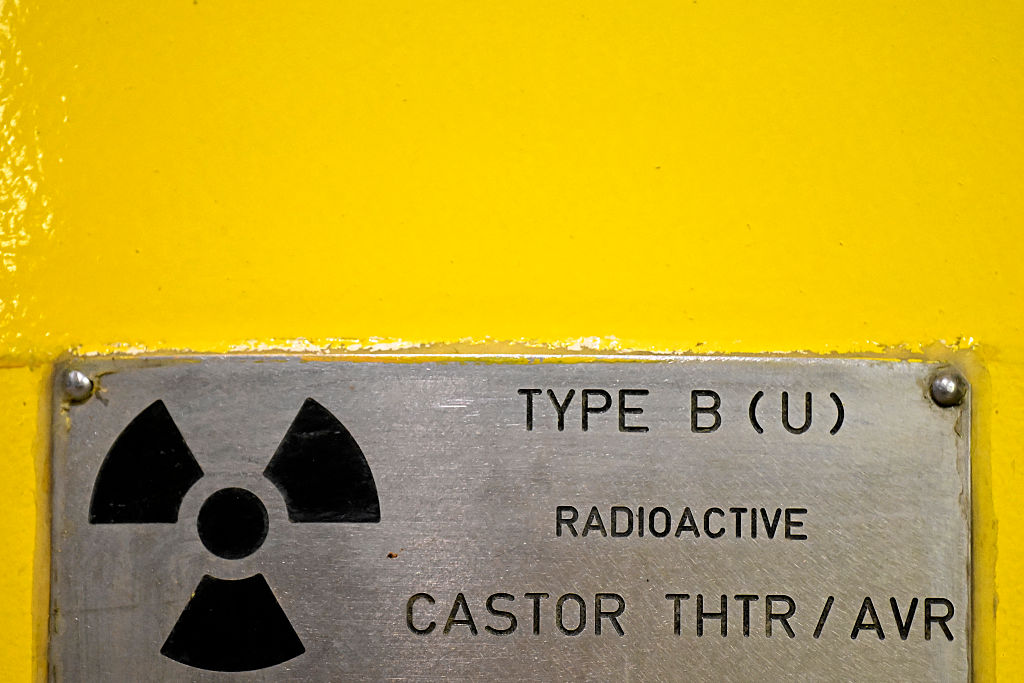Ein Warnschild auf einem Castorbehälter für hoch radioaktive Abfälle aus dem Hochtemperaturreaktor Hamm-Uentrop im Zwischenlager Ahaus in Westdeutschland am 18. September 2025. Foto: Ina Fassbender/AFP via Getty Images