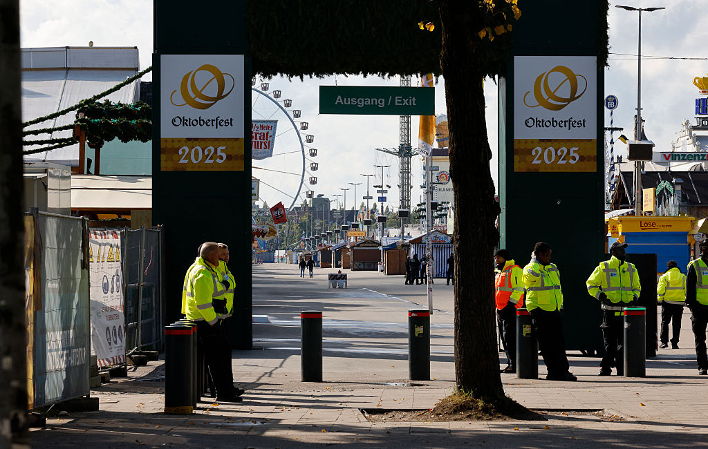 Sicherheitskräfte bewachen das derzeit noch geschlossene Oktoberfestgelände am 01. Oktober 2025 in München. Foto: Johannes Simon/Getty Images