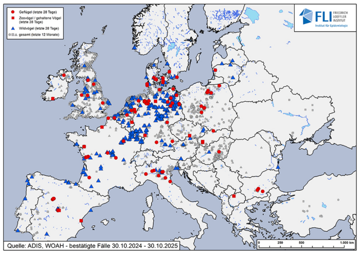 Vogelgrippefälle in Europa, Stand 30. Oktober 2025. Foto: Friedrich-Loeffler-Institut