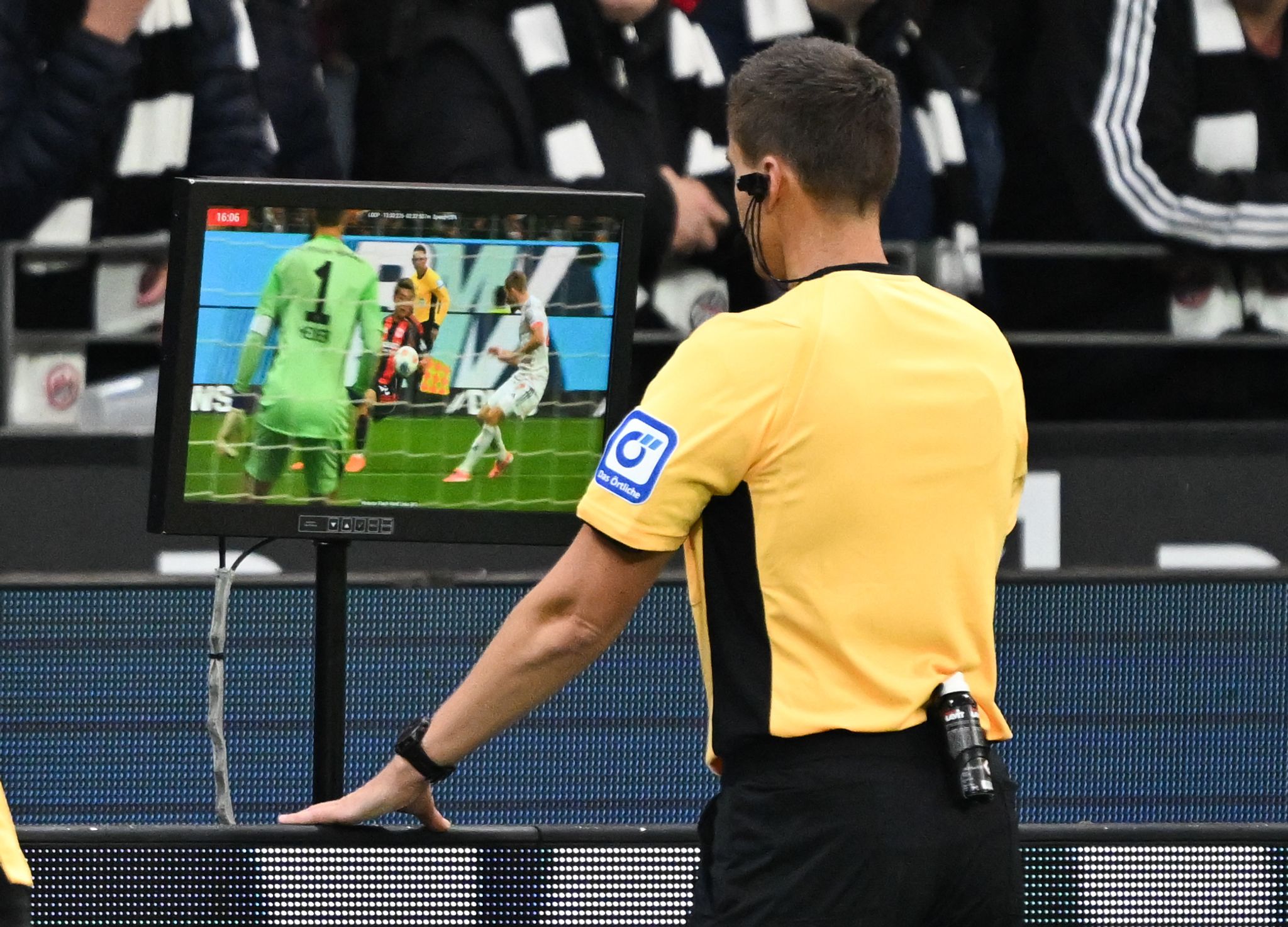 Schiedsrichter Daniel Siebert überprüft den vermeintlichen Ausgleich von Eintracht Frankfurt. Foto: Arne Dedert/dpa