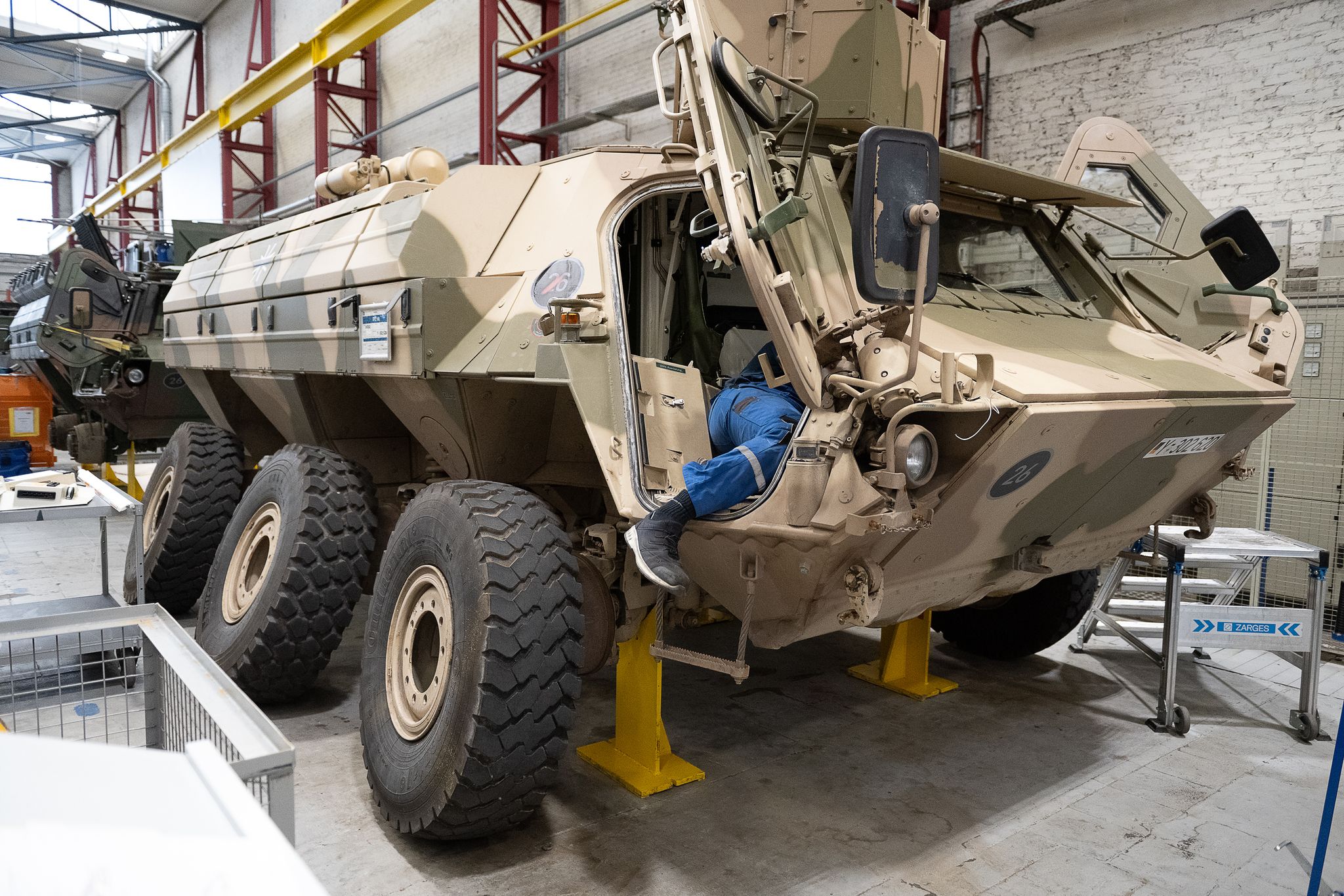 Ein Panzer vom Typ „Fuchs“ in der Fertigung des Rüstungskonzerns Rheinmetall. Foto: Swen Pförtner/dpa