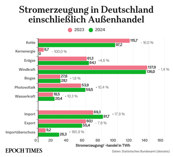 Stromerzeugung und -außenhandel in Deutschland in den Jahren 2023 und 2024. Foto: ts/Epoch Times. Daten: Statistisches Bundesamt (destatis)