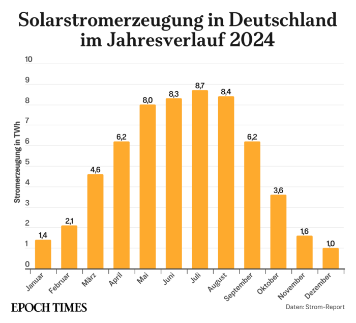 Monatlich eingespeister Solarstrom (ohne Eigenverbrauch). Foto: ts/Epoch Times, Daten: Strom-Report